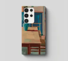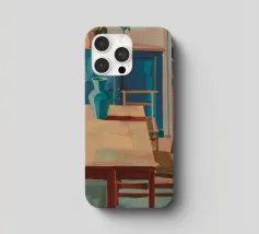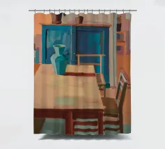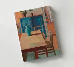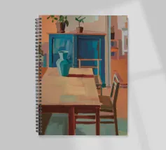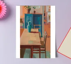 A wooden dining table stretches into a warmly lit interior filled with pottery and vibrant shadows, celebrating home�s quiet rhythm.