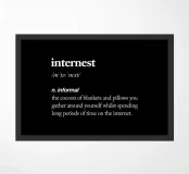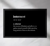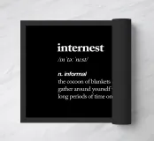 Embrace your digital comfort zone with our witty "Internet" typography art print. This clever design presents a humorous dictionary-style definition in crisp white serif text on a sleek black background, perfectly capturing the cozy reality of modern online life. Ideal for tech enthusiasts, homebodies, and anyone who appreciates a good Netflix binge, it adds a touch of relatable humor to any space. The stark contrast and formal typography style create a visually striking piece that's both amusing and stylish. Available on various products, this versatile design makes a perfect gift for the int