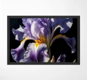 A stunning bearded iris in full bloom, captured in a close-up view against a dark background. The intricate details of the flower's ruffled petals, vibrant colors, and contrasting textures are beautifully highlighted. This exquisite artwork celebrates the beauty and elegance of nature's creations.