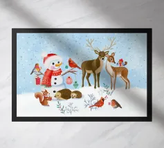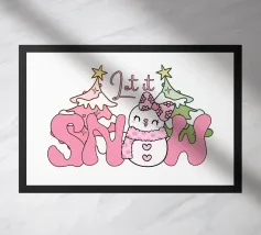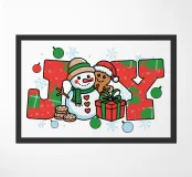 A cheerful snowman and a gingerbread person stand next to a large red "JOY" sign adorned with snowflakes and surrounded by holiday decorations. Gift boxes and festive ornaments add to the seasonal theme.