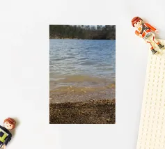 The lake surface lies calm and glassy, mirroring the sky above like a perfect reflection. Gentle ripples move across the water when touched by the breeze, making the sunlight dance in sparkling patterns.