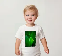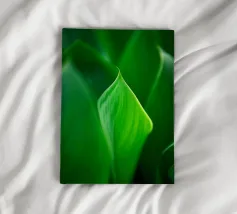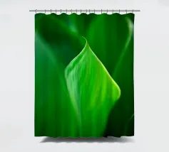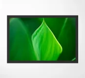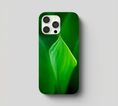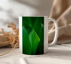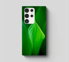 A single green leaf catches the light, its surface smooth and glistening with tiny droplets of dew