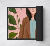 This painting shows a person wearing a brown coat and blue shirt standing against a pink background with green leaves. The combination of colors and the leafy backdrop adds an elegant and sophisticated touch to the scene.