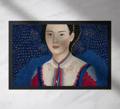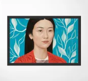 This artwork shows a person with long, dark hair wearing a red shirt. The background is filled with blue and white leafy patterns, creating a tranquil and peaceful atmosphere.