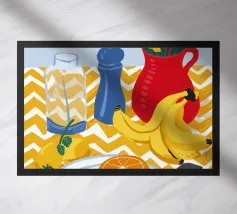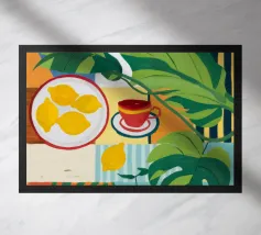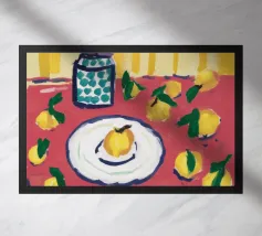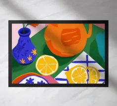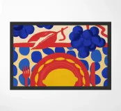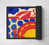 A bold, graphic pattern featuring a lemon sun motif, blue grapes or flowers, and red shapes. The style is modern and has a pop art feel.