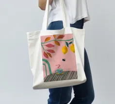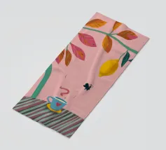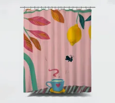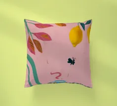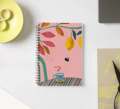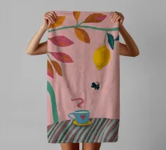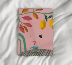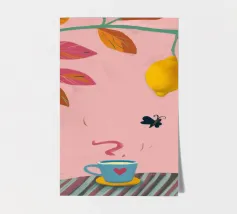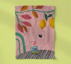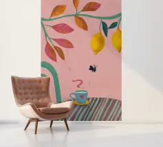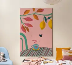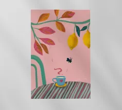 A lemon tree branch and striped teacup sit on a pink table, kissed by a falling leaf.