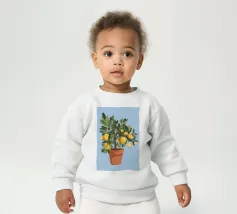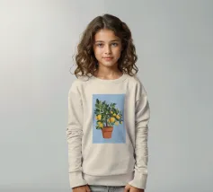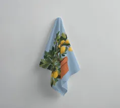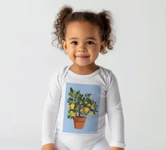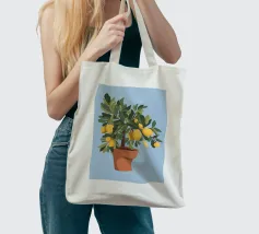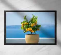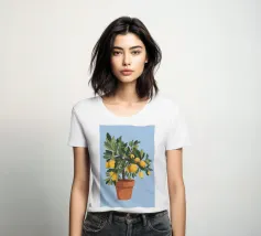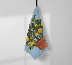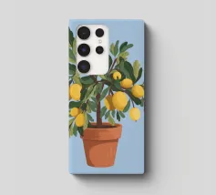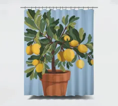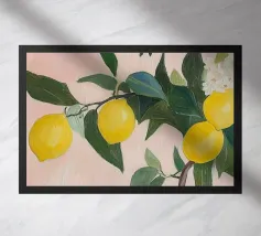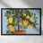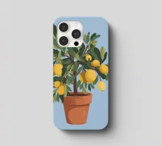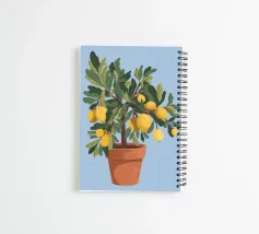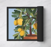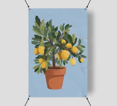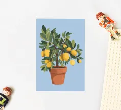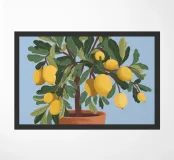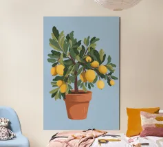 A painting of a lemon tree in a terracotta pot against a light blue background. The tree is full of ripe yellow lemons and green leaves.