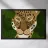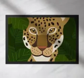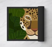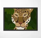 This image depicts a close-up of a leopard's face with a green leafy background. The detailed illustration of the leopard's features makes it visually striking and highlights the beauty of wildlife.