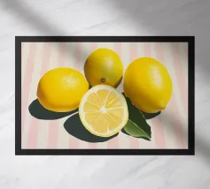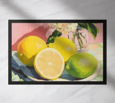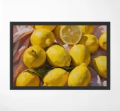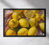 A vibrant oil painting capturing a group of fresh lemons in rich, sunlit hues. The textured brushwork and lifelike detail evoke freshness and warmth, making it a perfect visual celebration of citrus beauty and natural elegance. Ideal for kitchen or any other living or working space.