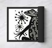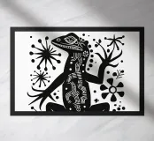 Psychedelic chameleon: folk art meets acid trip aesthetics. This hypnotic silhouette fuses Mexican folk art with 60s flower power in the purest black and white magic. The ornamental patterns are reminiscent of Oaxacan textile design, while the organic shapes channel pure Woodstock vibes. The mystical chameleon becomes a shamanic figure between transformation and meditation. A powerful statement for all those who love spiritual symbolism and traditional craftsmanship - pure wall alchemy, or on textiles.