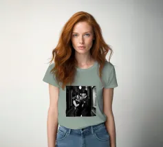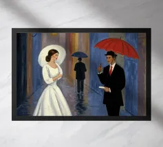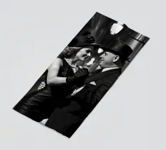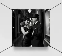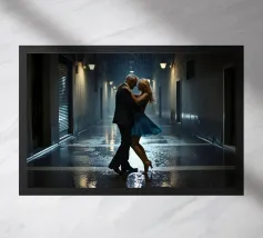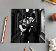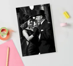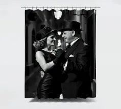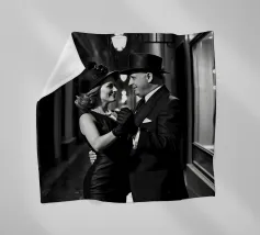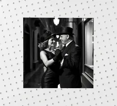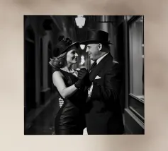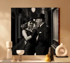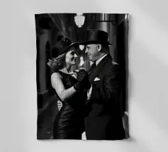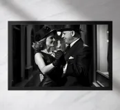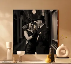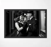 Vintage Dance in Rainy Alley, Classic Hollywood Photography A black and white photograph of a couple tap dancing in the rain. The woman, in a Marlene Dietrich-style outfit with cylinder hat in this classic Hollywood-inspired shot.