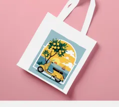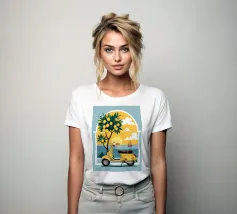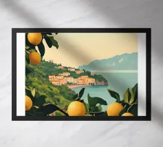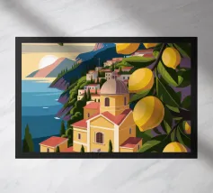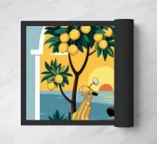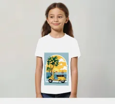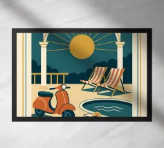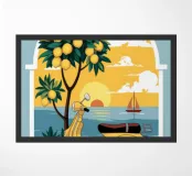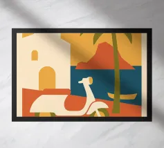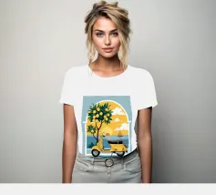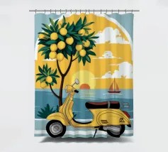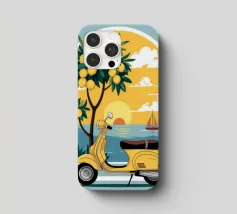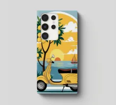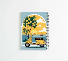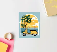 A yellow scooter is parked in front of a scenic Mediterranean landscape with lemon trees, a sailboat, and a bright blue sky, evoking a sense of adventure and relaxation.