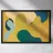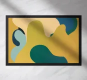 A calming abstract piece features flowing, liquid like shapes in a mellow, earthy palette of mustard yellow, green, and beige, creating a sense of gentle movement.