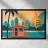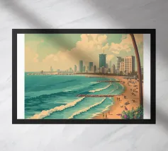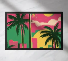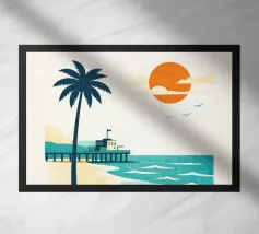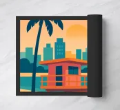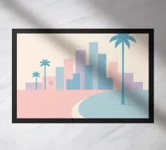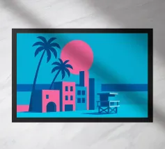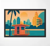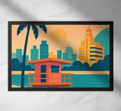 Minimalist Miami design with the famous lifeguard tower, palm tree, sea and various typical buildings. Decorative gift for anyone who loves this metropolis in the US state of Florida. Sunset mood by the calm sea in Miami.
