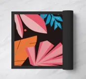 A stylish pattern of tropical leaves in shades of pink, teal, and orange is set against a dark background, evoking the lush and mysterious atmosphere of a tropical night.