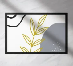 A minimalist composition features abstract shapes in shades of blue, brown, and yellow, combined with a simple black botanical element. The clean lines and subdued color palette create a modern yet natural aesthetic.