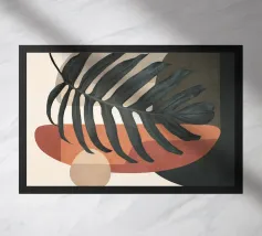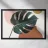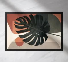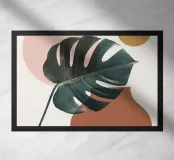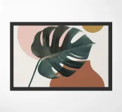 monstera leaf geometric shapes pink circle ochre circle botanical nature organic shapes plant foliage minimal design vase shape tropical theme natural elements leaf indoor plant cutout shapes negative space modern design tropical leaf decorative elements
