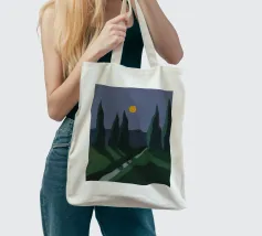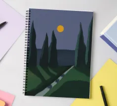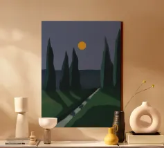 Tall, dark trees stand against a deep blue sky with a bright yellow moon, casting elongated shadows on the green landscape below. A narrow, winding path divides the grassy terrain, adding depth to the tranquil night scene.