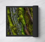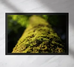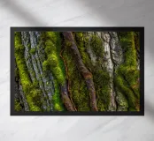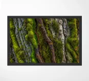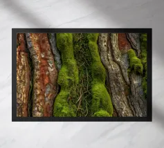 The bark of a large tree is adorned with vibrant green moss, intertwined with twisting branches, reflecting the tranquil ambiance of a forest in the early morning light.