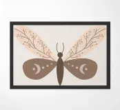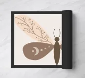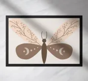 A stylized depiction of a moth features intricate designs on its wings, incorporating natural and celestial motifs. The wings display delicate outlines of branches and crescent moon shapes, set against a muted color palette.
