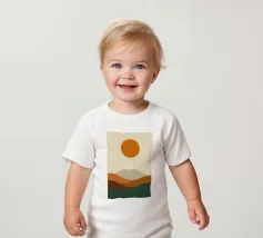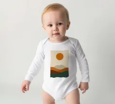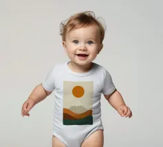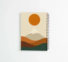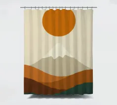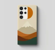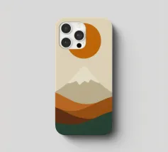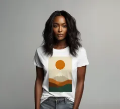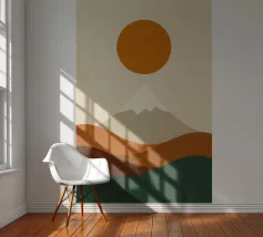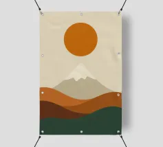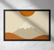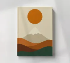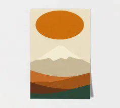 Mount Fuji rises here like a sacred silhouette, under a burning ochre sun suspended in a minimalist sky. The waves of earth-toned hills evoke an enveloping, almost meditative warmth. A graphic tribute to Japanese majesty, somewhere between retro abstraction and solar poetry.