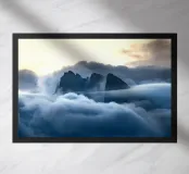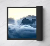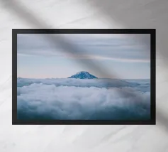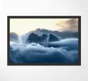 The clouds swirl gently around the slopes, hiding and revealing the rocky summits in a quiet dance. Sometimes, the mountaintops pierce through the mist, glowing in the sunlight above a sea of white. The scene feels peaceful and mysterious, as if the mountains are whispering secrets to the sky.