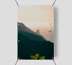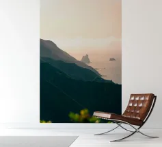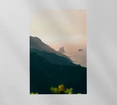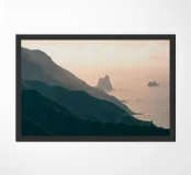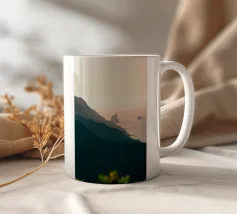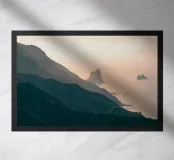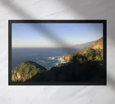Below, the deep blue waters crash against rocky cliffs, sending white spray into the air. The contrast is striking—solid, unmoving mountains standing tall above the ever-shifting waves. Together, they create a breathtaking meeting point of earth and sea, where silence and power coexist."