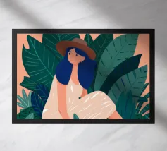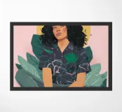 This artwork shows a person in a dark shirt with green leaves, sitting against a background of large green leaves. The scene reflects a connection with nature.