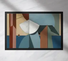 This artwork features an abstract representation of a nautical scene, with a sailboat and a figure rendered in flowing lines and shapes. The color palette includes shades of blue, beige, and white, evoking a sense of tranquility and elegance.
