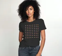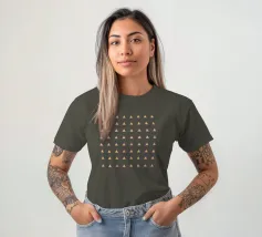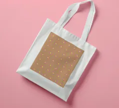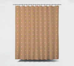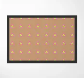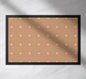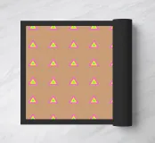 Stylish and minimalist geometric pattern with multicolored neon triangles in pink, yellow and aqua blue, on a latte brown background.