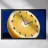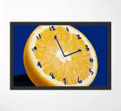A vivid orange slice is creatively used to mimic a clock face, with numbers and clock hands drawn on its surface. This surreal composition contrasts sharply with a deep blue background.
