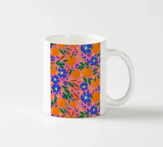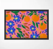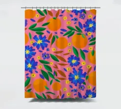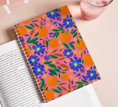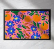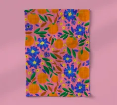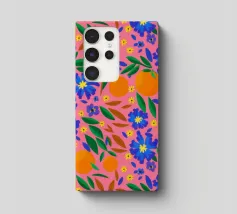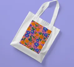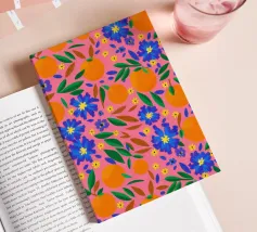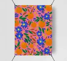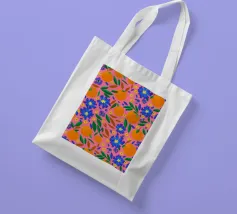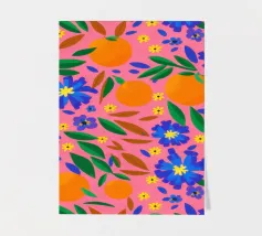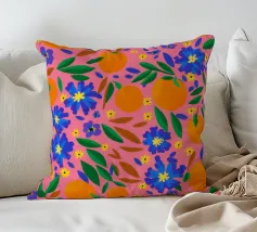 A vibrant and cheerful pattern of oranges nestled among green leaves on a bright pink background. This juicy and colorful design is full of energy and evokes the feeling of a sunny citrus grove.