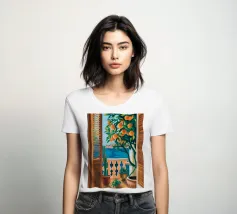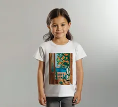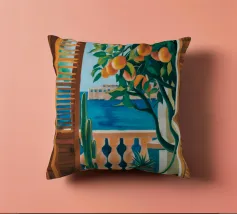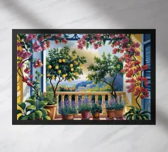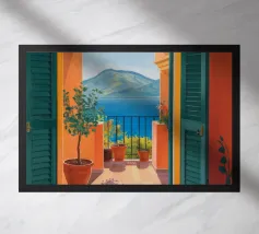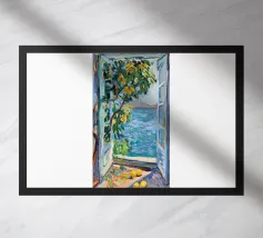 A view through a window of a beautiful orange tree, heavy with ripe fruit. The warm, sun drenched light and charming subject create a scene of rustic, Mediterranean abundance.