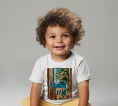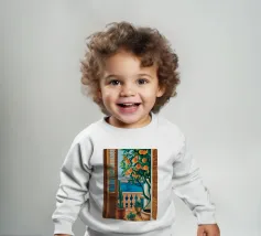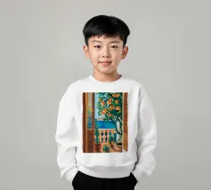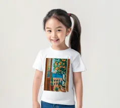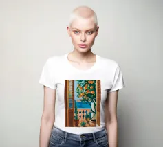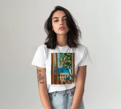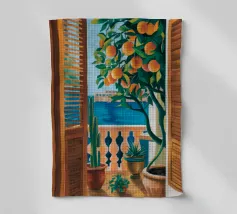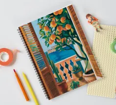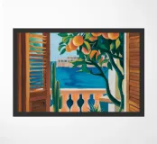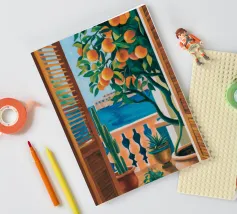 A view from inside a pink room, looking through an open window with blue shutters at an orange tree. The question mark detail adds a whimsical touch to this vibrant and charming scene.