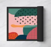 An abstract artwork composed of various geometric and organic shapes in a soft pastel color palette. Textured patterns and overlapping forms in shades of pink, green, yellow, and blue create a playful and modern piece.