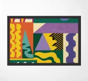 A playful and energetic abstract composition made of various patches of color and patterns, including florals, grids, and stripes, like a vibrant quilt.