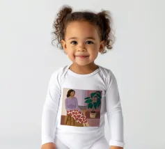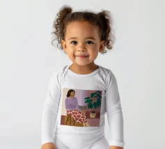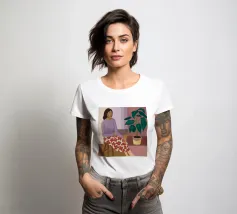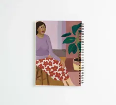 A woman in a purple top and patterned pants sits thoughtfully in a simple chair next to a large houseplant, capturing a moment of quiet, everyday contemplation.