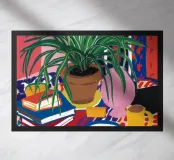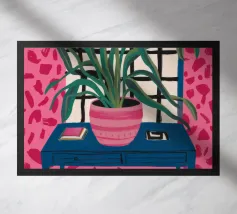 A still life of a potted plant and other objects on a table with a colorful, patterned rug underneath. The composition against a pink wall is modern, eclectic, and full of charming, decorative detail.