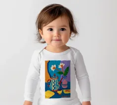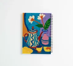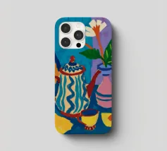 A whimsical and decorative still life with a focus on pattern. A blue and yellow patterned teapot, a striped vase with a flower, and a lemon are arranged in a playful, flat style that celebrates color and design.