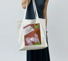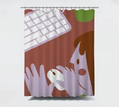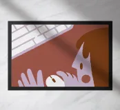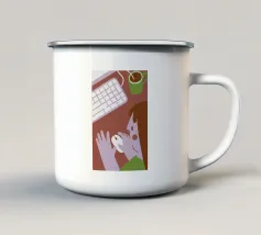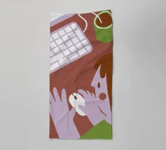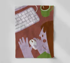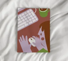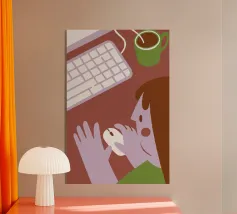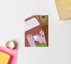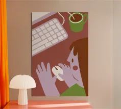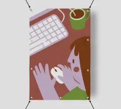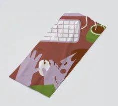 A friendly, warm-toned illustration showing someone using a computer mouse with both hands, alongside a keyboard and drink cup.