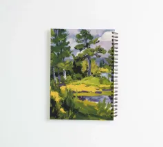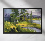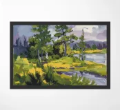 A landscape painting of a river bending through a meadow, with pine trees lining its banks. The grass is yellow and green, suggesting late summer or early autumn.