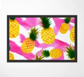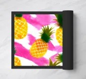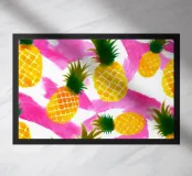 Cheerful pattern of bright yellow pineapples on a pink background. Generated with AI (Canva).