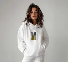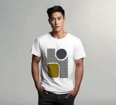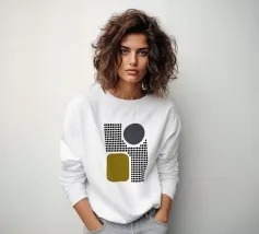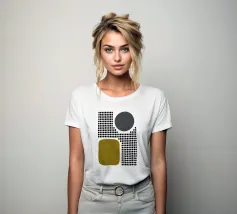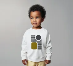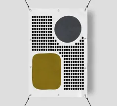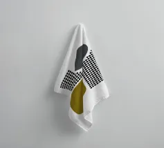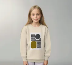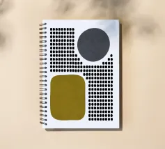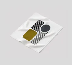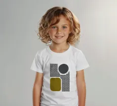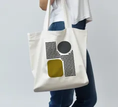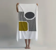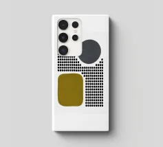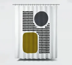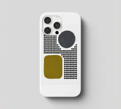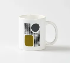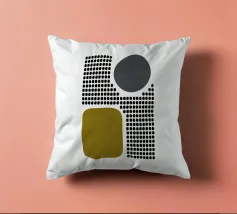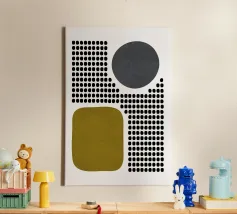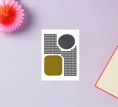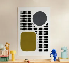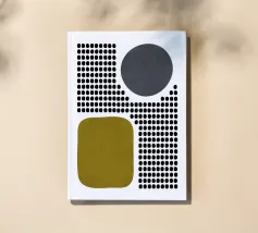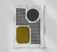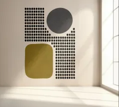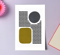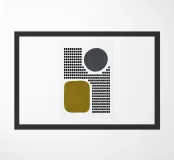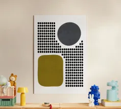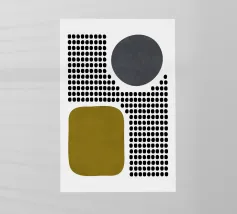A playful study of contrasting textures and forms. This piece juxtaposes a structured grid of tiny dots with solid organic and geometric shapes in olive green and slate grey. Its retro-modern aesthetic adds a unique graphic element to any contemporary living room or creative studio.