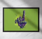 A colorful and detailed cartoon illustration of a zombie hand with vivid green and purple tones, dripping textures, and extended index finger. The hand is set against a bright green splatter background for a spooky effect.