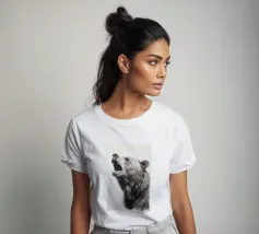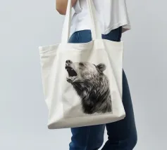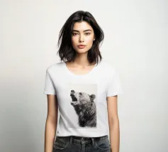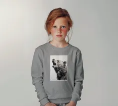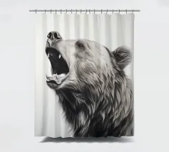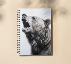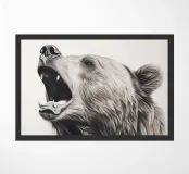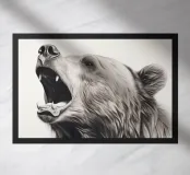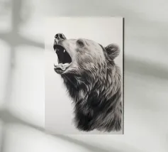 This minimalist pencil drawing of a roaring brown bear impresses with realistic details and fine fur structures. The white background highlights the animal portrait in black, white and beige with delicate colour accents.