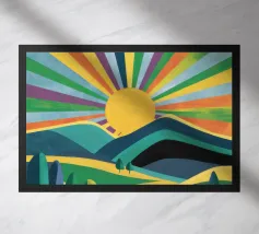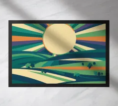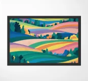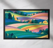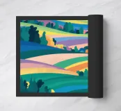 A beautiful landscape of rolling hills and fields, rendered in a colorful patchwork of greens, blues, pinks, and yellows, evoking a sense of idyllic countryside.