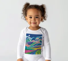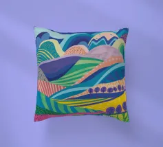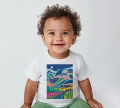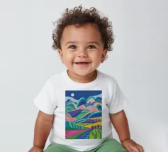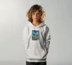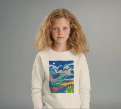 A vibrant, psychedelic landscape of rolling hills in a riot of color, under a starry night sky. The composition is a dreamlike, energetic, and imaginative depiction of a fantasy world.
