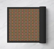 A repetitive geometric pattern features diamond shapes in warm brown and beige tones, interspersed with black and green lines. The design creates a visually intricate grid that is both symmetrical and uniform.
