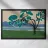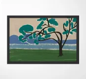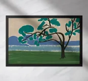 A solitary tree with broad green leaves stands in the forefront against a background with shades of blue, suggesting distant hills or mountains. The field is a vibrant green with brushstrokes visible throughout, and the sky has a beige tint, giving the scene a simplistic, almost childlike quality.