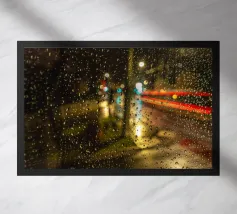 Raindrops cling to a window, creating a blurred view of a city street lit by soft lights in the background. This abstract backdrop captures a serene atmosphere perfect for mobile wallpaper.